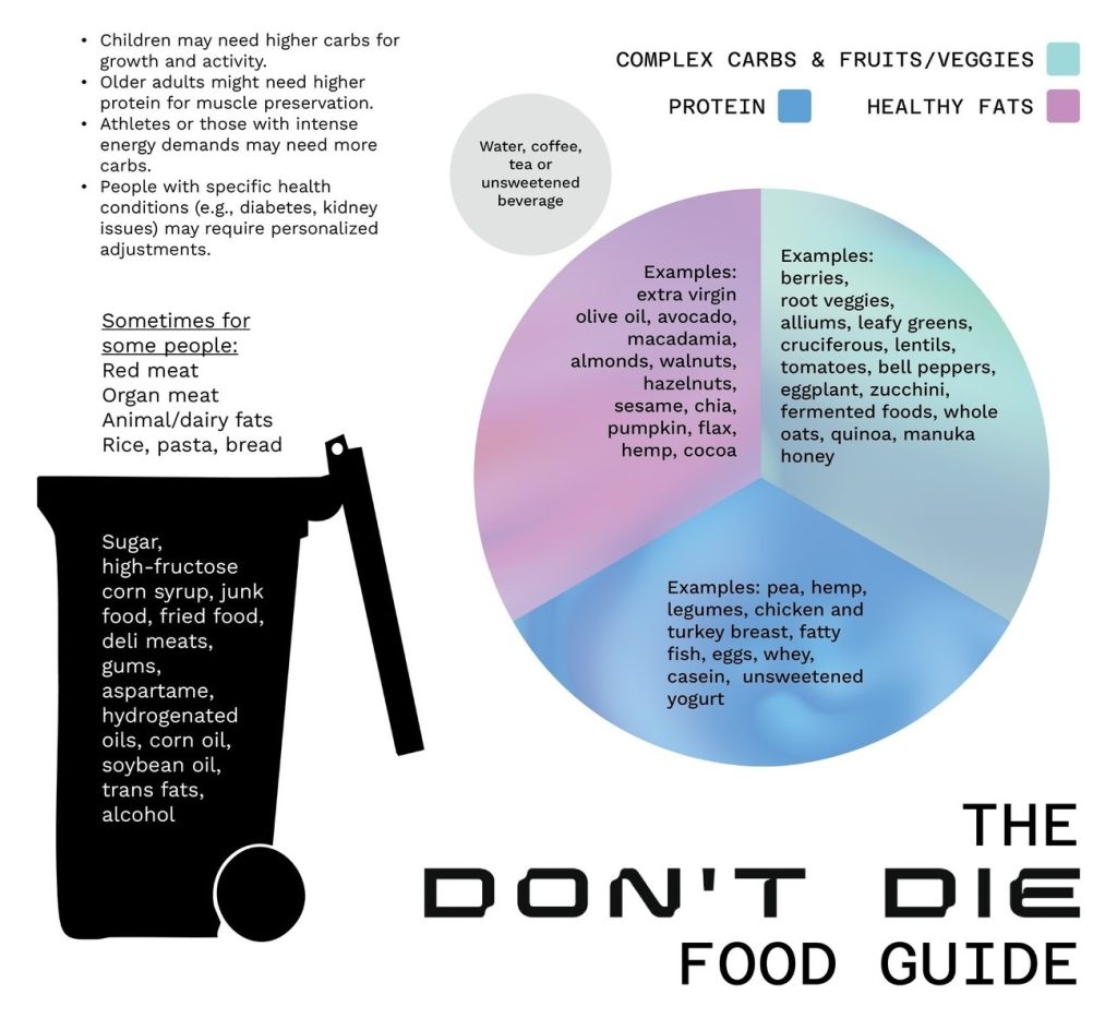 For a detailed breakdown, refer to the Don’t Die Food Guide graphic above.