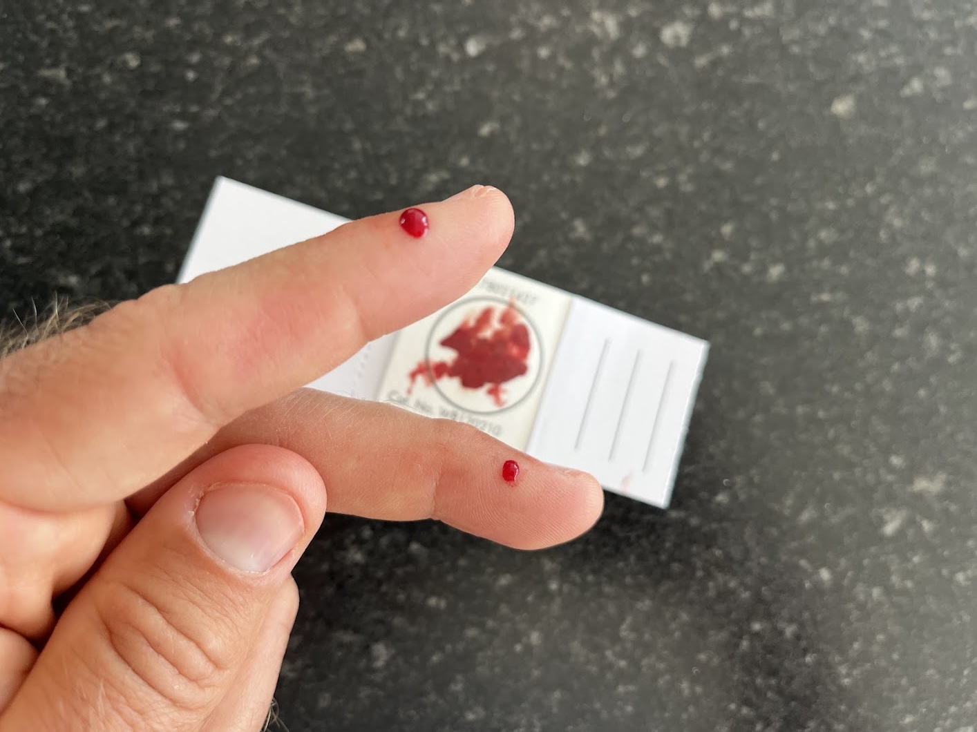 Blood started flowing. I wiped the first bit with gauze, then got to work blotting the card until the circle was mostly filled and it started showing through the other side. I snapped a photo, which captures the moment pretty good. Blood on my fingertip and the kit scattered around like a miniature crime scene, except the suspect is me and the motive is better data.